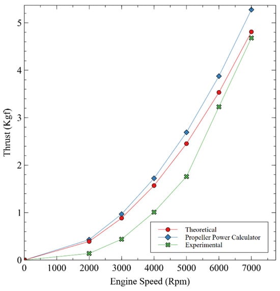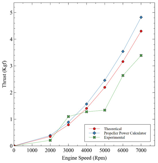 Theoretical calculations are conducted by considering several parameters related to thrust generation from the engine’s rotation and the used propeller. The theoretical calculation of thrust is grounded in the fundamental principle of physics that states every action induces an equal and opposite reaction. The action involves the force generated by the revolving propeller in propelling the air mass backwards, whilst the response represents the thrust that facilitates forward movement. The following Figure 5 is derived from the conducted calculations: