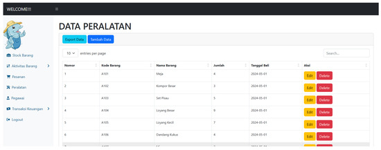 - Handayani, H.; Ayulya, A.M.; Faizah, K.U.; Wulan, D.; Rozan, M.F.; Hamzah, M.L. Perancangan Sistem Informasi Inventory Barang Berbasis Web Menggunakan Metode Agile Software Development. J. Test. Dan Implementasi Sist. Inf. 2023, 1, 29–40. [Google Scholar]
