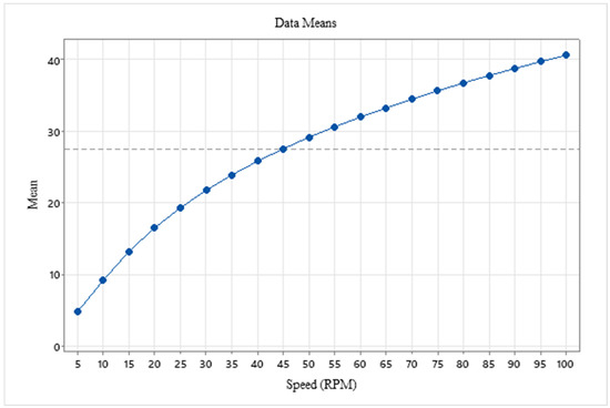 The main effects of speed on temperature were determined. On average, it can be noted that the dough temperature increases as the screw speed increases, as shown in Figure 4. As the screw’s rotational speed increases, it generates more friction with the material that it is in contact with. The frictional force converts mechanical energy into thermal energy, resulting in an increase in the system’s temperature [22]. Increased screw speeds might result in higher shear forces exerted on the material. Shear heating occurs when adjacent layers of material experience differential movement, resulting in friction and the generation of heat [17]. Effective temperature control and management are essential for ensuring product quality and optimizing process efficiency.
