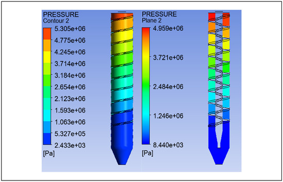 The force applied by the screw affects the quality and uniformity of the extruded dough. Increased pressure can lead to a more condensed and tightly packed product, while decreased pressure may result in a lighter and more porous composition. The optimal pressure is often determined based on the chosen quality of the end product [19]. Effective pressure control ensures unwavering dispersion of ingredients and moisture across the entire dough. Inadequate pressure can result in irregular blending, resulting in alterations in the quality and visual characteristics of the extruded product [20]. By applying the appropriate force, the dough can be effectively blended, leading to a uniform outcome [21]. Figure 3 shows the flow visualization of pressure at a speed of 50 RPM. It is evident that the pressure is high at the entry point and reduces as the material flows towards the exit.