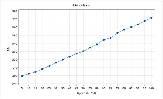 Mains effects were investigated to assess the influence of varying speeds on temperature and pressure. Figure 2 displays the variation in pressure with changes in the screw speed. The vertical axis shows the mean values of pressure while the horizontal axis shows the values of screw speed. The figure indicates a rise in pressure with a rise in screw speed. This can be attributed to the rise in energy requirement for material flow as the screw speed increases [18]. Increasing screw speeds causes the fluid or material being processed to flow more quickly, resulting in a higher amount of kinetic energy transferred to the fluid. A rise in kinetic energy results in an increase in pressure within the system [19]. Higher screw speeds can result in greater frictional heating. This can influence the viscosity of the material being processed, which in turn affects the pressure of the system [4].