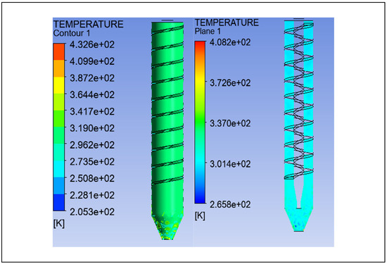 The temperature impacts the viscosity and elasticity of the dough. High temperatures decrease the viscosity of the dough, hence facilitating the process of extrusion. However, higher temperatures might excessively strain the gluten network of wheat dough, resulting in changes to its texture and structure. Regulating temperature facilitates the process of browning and enhances the formation of flavors, thus enhancing the overall taste of the product [23]. Nevertheless, excessive heat has the potential to cause burns or result in an unpleasant taste. Temperature has a significant impact on protein denaturation in dough. Optimal temperatures promote protein denaturation, leading to improved dough pliability and texture. High temperatures can cause proteins to degrade and lose their functionality, which can have a detrimental effect on the manipulation of dough and the overall value of the finished product [4]. Figure 5 shows the flow visualization of temperature at a speed of 50 RPM, which remains moderate with areas of localized high temperatures that can be attributed to the effects of friction heating and shear stresses.
