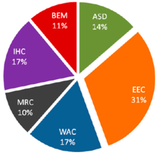 In the certification process in Indonesia, there are Greenship Rating Tools issued by GBCI [17] to determine the results of achieving green retrofitting ratings, consisting of six aspects or criteria, namely, appropriate site development (ASD), energy efficiency and conservation (EEC), water conservation (WAC), material resource and cycle (MRC), indoor health and comfort (IHC), and building environment management (BEM) as shown on Figure 1. There is also a benchmark for green retrofitting based on PUPR Minister Regulation Number 21 of 2021.