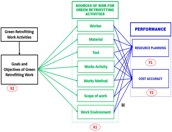 Based on literature studies and previous research that discuss the risks of green retrofitting work for WBS-based high-rise buildings, the risks affect’s cost of implementing green retrofitting. So, we get variable X (independent variable) in the form of the risk of building a WBS-based green retrofitting project, which can affect variable Y (dependent variable), namely, resource planning and the accuracy of the cost of implementing green retrofitting.