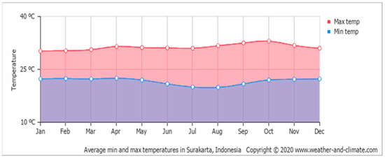 Figure 1 shows that the maximum monthly average temperature in Surakarta occurs in October and the minimum in January. Meanwhile, the average annual maximum temperature reaches 31.4 °C, and vice versa the minimum temperature is 21.8 °C.