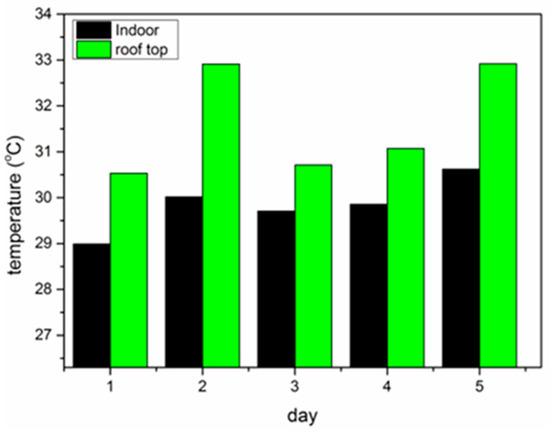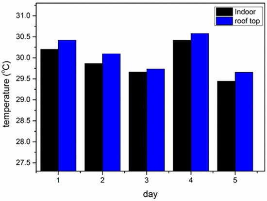 Data from measurements of the average outside (roof) air temperature shown in Figure 2, which was measured in August 2021, shows figures ranging from 29.26 °C to 30.58 °C or an average value of 29.94°C. Figure 3 also displays data from outdoor air temperature measurements measured in April 2021 showing results between 30.44 °C to 33.15 °C or with an average value of 31.65 °C. When compared with Figure 1, the average minimum and maximum monthly temperatures for Surakarta in the same month align well with these two measurement data points. This consistency indicates that the measuring instrument used performs reliably, producing accurate and credible measurement results.