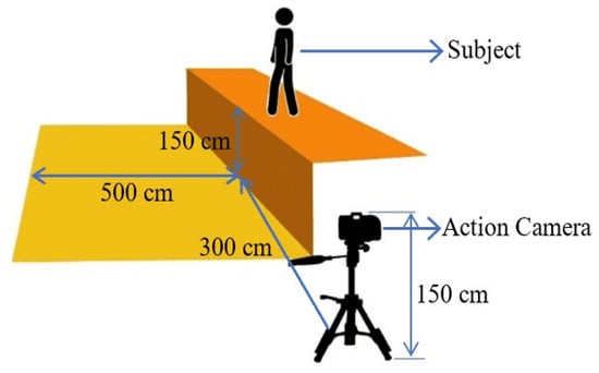 The camera is placed on a tripod at a distance of 150 cm to produce good footage of the jump movement from a platform height of 150 cm perpendicular to the middle of the track at 300 cm, as shown in Figure 3.