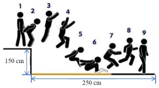 Subjects were instructed to drop jump from a high platform and land at their average speed, analyzing the subject’s movement phase while landing in a stable posture. Group 1 comprised three participants who leaped forward; in Group 2, three dropped backward. Each subject performed the repetition five times. The drop jump movement forward and backward follows the same jumping phase in Figure 4, which includes (1) heel up, (2) squat, (3) push, (4) jump, (5) land, (6) second squat, (7) second push, (8) second jump, and (9) second landing.