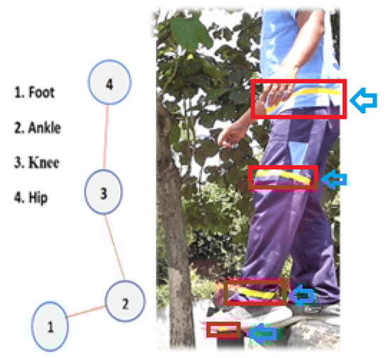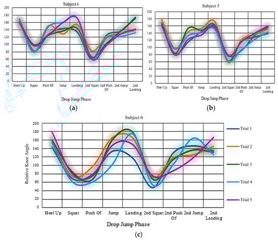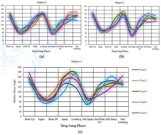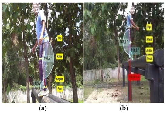 The relative knee angle was measured using the Kinovea program with four marker points [37], and the position of the leg muscles was examined [38]. The two markers beside the knee provide an angle relative to the subject’s knee. The relative knee angle varies throughout the leap, depending on the motion phase [39]. The parameter used in this investigation is the change in angle to the motion jump phase [40]. The observed subjects retain experimental data.