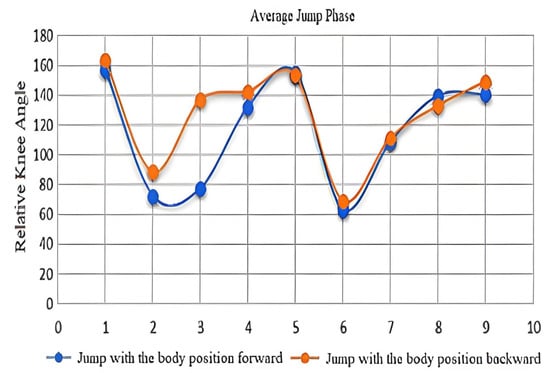 The difference in the average relative knee angle of the high jump is shown in eight phases, with the forward body position having a lower angle value. Elongated (eccentric) or shortened (concentric) muscles are tighter and more prone to cramping due to excess weight. If the knee angle is modest, greater muscle contraction is required to retain and push the body—the difference in knee angle relative to the leap, as shown in Figure 11.