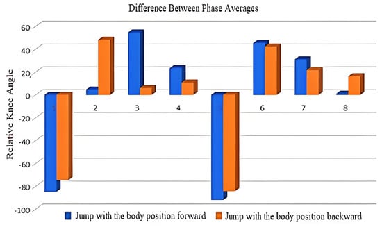 The change in average relative angle for the forward leap from the heel-up phase to the squat phase reduces the relative knee angle to −84.68°, whereas the back jump is −74.57°. When you spring forward, your leg muscles contract more tightly, causing muscular cramps. On the contrary, placing the hands in front of the body during a backward jump improves body mass balance and helps to reduce the gravitational force exerted. Leaping from a height with the body positioned rearward is more regulated.