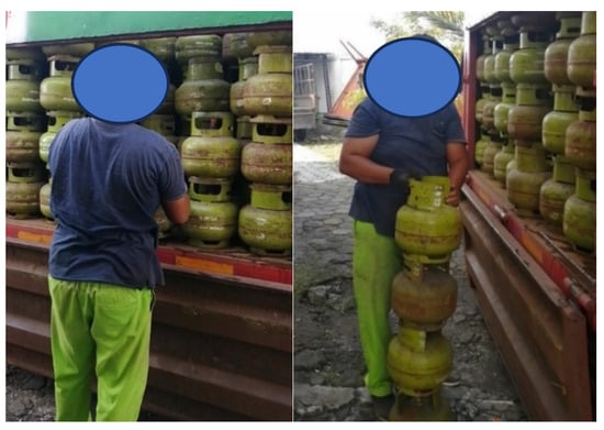 At PT XYZ, workers handle LPG gas cylinders manually. There are four workers responsible for manual material handling, and the transfer of 3 kg LPG gas cylinders from the truck is performed by two workers at a time. This transfer occurs repeatedly across 13–15 different LPG stations in a day. The conditions for handling the 3 kg LPG gas cylinders are relatively similar at each station, with the cylinders unloaded from the side or rear of the truck onto the flat ground, stacking them vertically in four layers. The frequency of lifting 3 kg LPG gas cylinders from the truck to the ground ranges from 30 to 100 cylinders per station. Each truck carries 560 cylinders, and the total number of cylinders transferred in a day is 1120. The activity is shared between two workers: Worker 1 positions the cylinders within reach inside the truck, while Worker 2 lowers the cylinders from the truck to the ground at the LPG station. Each LPG gas cylinder weighs 8 kg, with the empty cylinder weighing 5 kg and the LPG content weighing 3 kg. Lifting these cylinders manually, if performed improperly, can lead to injuries.