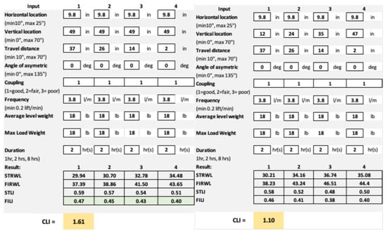 The National Institute for Occupational Safety and Health (NIOSH) developed the Revised NIOSH Lifting Equation (RNLE) to measure the Recommended Weight Limit (RWL) and the Lifting Index (LI), which are used to estimate the physical demands of manual material handling activities [11]. This mathematical model, developed by the NIOSH, helps identify and assess lifting activities that pose a risk of MSDs for workers [6]. Waters et al. [12,13] explained that, in manual material handling tasks involving repetitive lifting, it is essential to consider the risk of injury by applying ergonomic principles, such as the Composite Lifting Index (CLI) provided by the Revised NIOSH Lifting Equation. The CLI provides information on the risk associated with multi-task lifting jobs.