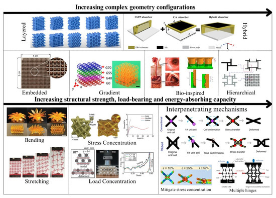 The design of metamaterials often takes cues from nature, with structures inspired by elements like bones and nacres. These natural designs frequently incorporate periodic cellular or lattice patterns, enhancing their mechanical properties through geometry [17,18]. Figure 3 depicts the classification of various metamaterials with innovative architectures. Ref. [13] reported that auxetic designs with negative Poisson’s ratios led to enhanced toughness and impact resistance in specific directions. Similarly, hierarchical lattice structures resulted in the tailoring of exceptional strength with lightweight properties, demanded by aerospace applications [2]. Patterns inspired by nature, such as honeycombs and chiral structures, have become popular among engineering researchers. These structures exhibit excellent mechanical performance and manufacturability as required for additive manufacturing processes [10]. To take these designs to the next level, researchers often rely on optimization tools like generative design algorithms and topology optimization. These tools assist fine-tune designs by weighing critical trade-offs such as density, stiffness, and resistance to failure to ensure the final structure performs as intended [3,12].