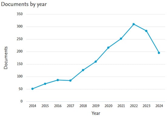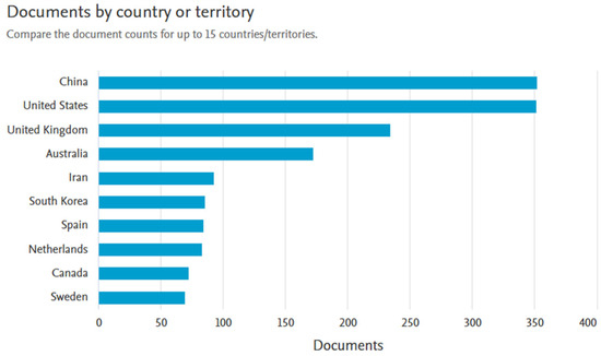 Scopus identified 1.834 documents from various countries, as shown in Figure 4. The countries with the highest contributions during 2014–2024 were China with 352 documents, the United States with 351 documents, the United Kingdom with 234 documents, and Australia with 172 documents.