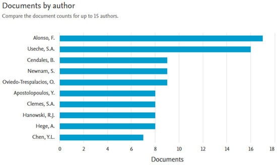 Bibliometric analysis identified the authors and the number of citations. The results can be seen in Figure 2; no author has a dominant number of studies. On average, authors have only 1–17 studies on bus accident research, as shown in Figure 3.