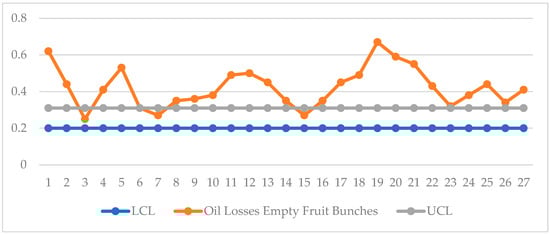 The results of the oil loss testing are visualized using a control chart with a lower control limit (LCL) of 0.20% and an upper control limit (UCL) of 0.31%, which represent the company’s standard for oil loss from empty fruit bunches. The diagram of the oil loss testing results for empty fruit bunches can be seen in Figure 2.