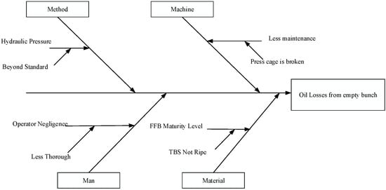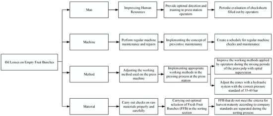 Problem-solving caused by several factors can be represented in a tree diagram. A tree diagram is a tool used to break down any concept, such as policies, targets, objectives, ideas, problems, tasks, or activities into lower and more detailed levels []. A tree diagram starts with one item that branches into two or more stems; then, each stem will branch into two or more branches and so on. The results of creating a problem-solving tree diagram for oil losses in empty fruit bunches can be seen in Figure 5.
