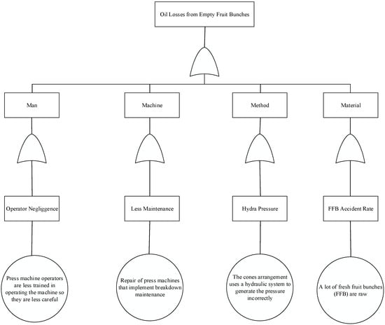 Oil losses from empty fruit bunches in the processing of crude palm oil occurring at PT. XYZ were analyzed using the fault tree analysis (FTA) method, as Figure 4. Fault tree analysis is a systematic method used to analyze the causes of a risk.