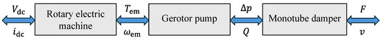 The proposed electromagnetic shock absorber is based on the prototype presented by Puliti et al. [14]. As depicted in Figure 1, a rotary electric machine is coupled to a gerotor pump and together they supply a controlled differential pressure to a monotube damper.