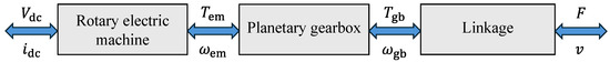 where combines all the rotating inertias at the output shaft and all the friction terms. For the EHA, coincides with the electric machine speed , whereas for the ROT, it coincides with the output shaft speed, i.e., downstream the gearbox. However, for the EHA, the piston mass and frictions must be added, too. Although this representation is being introduced for electromagnetic shock absorbers, it can be applied to a wide range of force or servo actuators where linear-to-rotary conversion is exploited. Actuators employed in aerospace applications could be represented through a similar model [15].