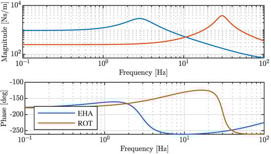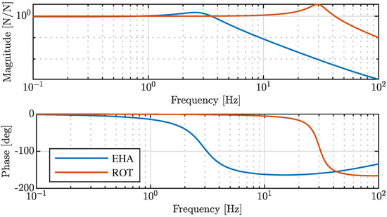 The generalized MISO model can be divided into the sum of two contributions, as already stated in Section 2.3. Considering , the transfer function of the output force from the actuation force can be plotted in the frequency domain (Figure 6). The two technologies are compared in this graph. Both prototypes show a unitary gain at low frequency and a null phase lag, meaning that the output force F is exactly in phase and equal in magnitude to the actuation force . More accurately, the EHA static gain is 0.95 because an increased leakage flow yields a lower damping , which hinders the effectiveness of the force transmission. Two resonant peaks arise, respectively, at for the EHA and for the ROT. This translates into a wider actuation bandwidth for the ROT prototype of almost a decade. However, the increased losses in the EHA attenuates more effectively the resonant peak, limiting the unwanted magnitude amplification. This phenomenon denotes the interaction between inertial () and stiffness () terms. Afterwards, both systems are dominated by their compliance. In particular, the EHA has a stiffness one order of magnitude lower than the ROT. In the former case, transmission stiffness is dominated by the oil bulk modulus. In the latter, the gear tooth stiffness plays a fundamental role.