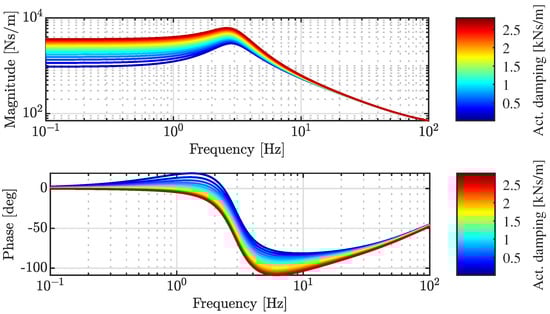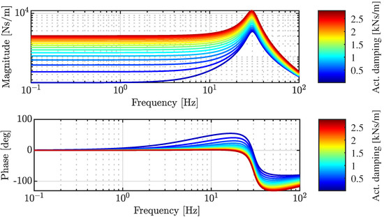 The simplified SISO model reduces to a mechanical impedance transfer function. The two case studies are shown in Figure 8 for the EHA and in Figure 9 for the ROT. The actuation damping is parameterized from 0 to . The shape follows the transfer function both in module and phase. In fact, the static gain is still the value of damping , slightly affected by the leakages in , where present. In both prototypes, the action of the actuation damping increases the gain at low frequencies, and limits the resonant amplification and the inerter effect.
