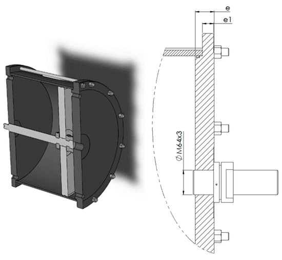 The “tail” flat end is provided of a threaded hole for an angular stroke adjustment stopper bolt represented in Figure 3 and another one for the pneumatic supply, both requiring a verification for the need of a reinforcement thickening, according to par. 10.6 of EN13445-3, by means of the identification of factors of thickness increment, called Y2, and depending on hole number, size, and distance. The maximum identified amplification factor Y2MAX concerns the distance between the two holes and brings to the required total thickness found with Formula (8).