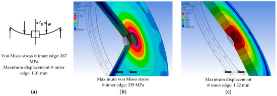 Comparison between formulas and FEA for the verification of a tail flat end subjected to a concentrated load: (a) results of formulas of case 1b of Table 11.2 of Chap. 11 of Roark’s Manual, “Annular plate, uniform annular load at a radius r0; outer edge simply supported”; (b) peak stress values found with DBA “Direct Route”; (c) maximum displacement from same FEA model.