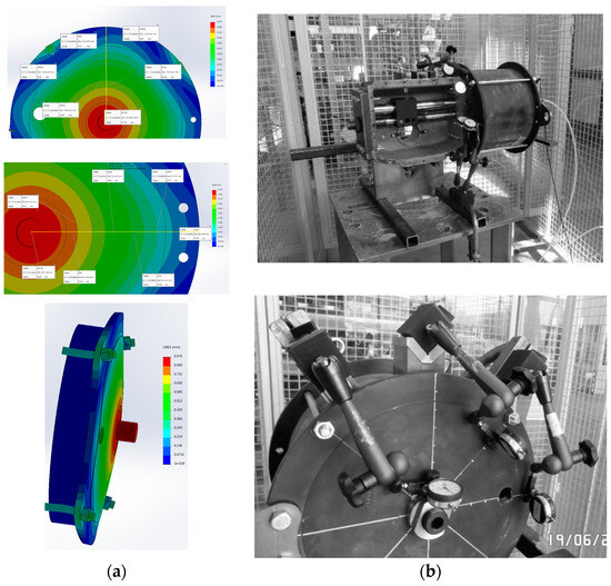 (a) Deformation map of the tail flange obtained with an FEA model of the real prototype; (b) phases of the direct deformation measurement on the real prototype.