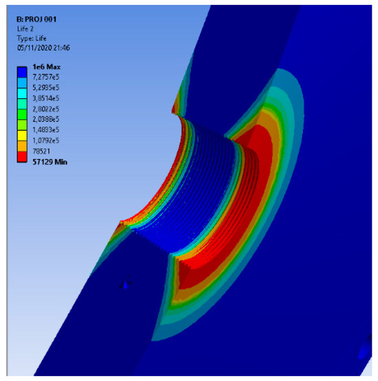 Formula-based fatigue checks provide data on the single components, and the designer must rebuild with a deduction the overall view of the life of the equipment as a whole. For this reason, a second purpose of an FEA is to help designers by providing an immediate, more accurate overall view of the fatigue behavior of the cylinder as a whole thanks to fatigue life tools. For this second purpose, an integrative fatigue simulation with the Ansys Mechanical® vers. 19.2 fatigue tool was performed. The results reported in Figure 9 show the minimum allowable fatigue cycles predicted by the FEA (57,129), aligned with the result of Formula (10) (53,272). Figure 9 also shows the areas where a failure could arise, in correspondence with the first threads of the stopper bolt hole. By repeating the simulation with lower operating pressures, it was possible to check and have confirmation in a single overall view of the infinite fatigue life of all the components.