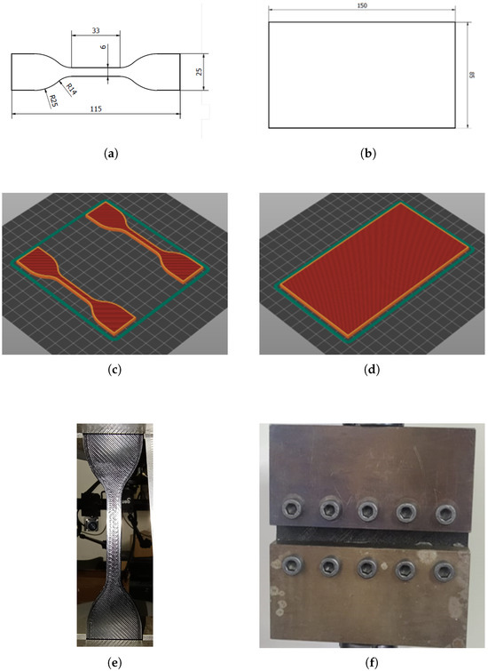 Technical drawings of the (a) ST sample and (b) PT sample. Preview of the printing job in the slicing software, (c) ST, and (d) PT samples. Images of the (e) ST and (f) PT samples after gripping.