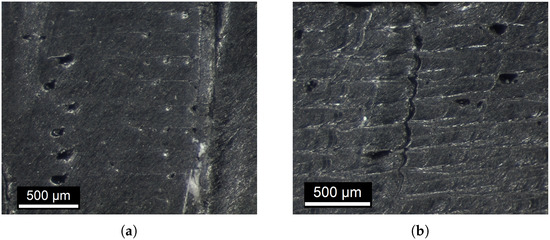 The position of the samples on the building base was carefully selected to limit warping and ensure uniformity across the tested conditions. Two ST samples were printed in each batch (Figure 1c), whereas PT samples were manufactured one at a time (Figure 1d). Samples were oriented horizontally on the building base and printed following a 45°-oriented rectilinear path with respect to the tensile orientation, and a 90° orientation change between consecutive layers was selected. Indeed, Xiao et al. [7] reported that the best mechanical properties for FFF-TPU were achieved with a 45°-oriented deposition path, whereas Bruere et al. [19] highlighted that the use of alternating deposition paths improves parts structural integrity. Figure 1e illustrates the ST sample after gripping. To guarantee a pure shear deformation state in planar tension testing, the width of the sample should be much larger than its length with respect to the loading axis [43]. For this reason, the samples were designed with a length–width ratio of at least 1:10 after gripping (as illustrated in Figure 1f) to limit the influence of edge effects at the center of the sample. The cross-sections of both samples were investigated with a DM2500M Optical Microscopy (OM) by Leica Microsystems. Figure 2 reveals typical defects associated with the FFF printing process [5,44], mainly observed at the interfaces between consecutive layers, where incomplete bonding or the formation of gaps between deposited filaments occurred.