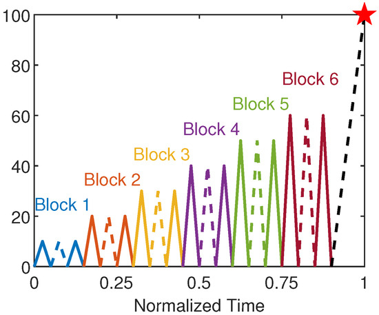 Example of loading history for repeated cycles. Solid lines denote the first and last cycles, while dashed lines represent the intermediate cycles. The red star indicates the fracture point.