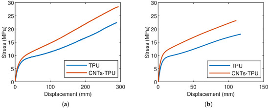 This section illustrates the results of monotonic testing conducted on both TPU and CNT-TPU under ST and PT loadings. Tests were performed until the sample failed to investigate the influence of CNTs on both strength and flexibility. Three repetitions were performed for each test; due to the high repeatability of the materials’ response, only a representative curve is presented. Figure 4a illustrates the monotonic engineering stress vs applied displacement curves under ST conditions. Both materials exhibit the non-linear hyperelastic behavior typical of elastomers, and their characteristics are akin to those reported for TPU and MWCNT-TPU in [5,35,45]. Indeed, at very low deformation levels, the materials demonstrate a high initial stiffness, followed by a transition to a plateau region characterized by a relatively constant and lower slope. This behavior is coherent under PT testing as well, as illustrated in Figure 4b. Table 2 summarizes the displacement and stress values measured at the failure point for both materials. The average maximum stress for TPU is MPa and MPa under ST and PT testing, respectively, whereas it increases to MPa and MPa for CNT-TPU. The latter material shows an improved mechanical strength of 27–29%, which could be linked to the reinforcement effect due to CNTs [46]. However, no significant variations in the displacement at failure have been recorded, with differences between the two materials lower than .