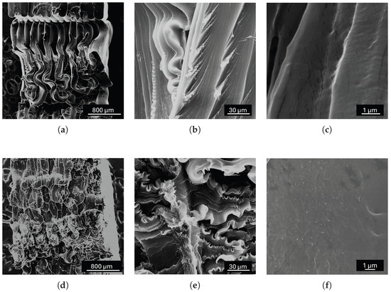 Fracture surfaces under monotonic ST loadings. TPU: (a) overview of the fracture surface; (b,c) higher magnification micrographs. CNT-TPU: (d) overview the fracture surface; (e,f) higher magnification micrographs.