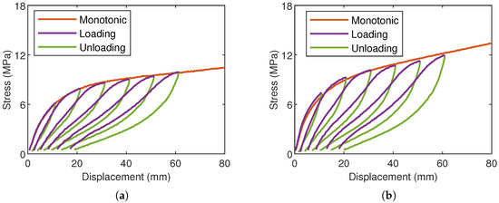Both TPU and CNT-TPU display significant stress-softening during the first cycle. However, the stress-displacement curves during the first five cycles, illustrated in Figure 8a,b for TPU and CNT-TPU, highlight the presence of slight, yet still observable, changes in material response in subsequent cycles as well, with narrower loading–unloading loops indicating reduced energy dissipation. The change in shape in the stress–strain loops at different deformation levels can be associated with changes and rearrangement of the polymeric matrix under straining, a phenomenon often observed in these materials. In fact, the behavior exhibited by FFF TPU in this study aligns well with findings reported in the literature for the conventional counterpart. Qi and Boyce [2] observed that the stress–strain curve of the second cycle is more compliant than that of the first, where the most pronounced softening effect occurs. Similarly, Avanzini and Gallina [64] noted a change in the shape of the stabilized stress–strain curve, if compared to the first cycle, with narrower loading–unloading loops. They attributed the softening behavior of TPU under cyclic loading to two key factors: the mechanical reorganization of the hard domains and thermal effects due to material self-heating. Indeed, part of the energy dissipated in the hysteresis is converted into heat [3]. Wang et al. [45] demonstrated that the extent of the hysteretic loop during the first cycle is strongly influenced by the filler content, whereas subsequent cycles show a reduced sensitivity to this factor. The peak stress reduction as a function of the cycle number is depicted in Figure 8c,d. As expected, this reduction is most pronounced during the first cycles, after which it progressively diminishes, with minimal variations observed beyond the 10th cycle. In the transition from the 1st to the 2nd cycle, the extent of stress reduction depends on the applied displacement level. For a displacement level of 10 mm, both materials exhibit the lowest stress reduction, measuring for TPU and for CNT-TPU. As the applied displacement increases, this effect becomes more pronounced, with average values of for TPU and for CNT-TPU. The stress reduction between consecutive cycles was fit with an exponential law, , and the best-fit coefficients were calculated as and for TPU, and and for CNT-TPU. From the negligible differences between these coefficients, it is possible to state that both materials demonstrate similar behavior in terms of stress reduction across successive cycles.