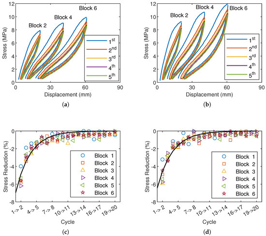 Changes in the cyclic stress–displacement response of (a) TPU and (b) CNT-TPU under ST during the first five cycles. Normalized peak stress reduction between consecutive cycles for (c) TPU and (d) CNT-TPU. Fitting with an exponential law (black solid lines).