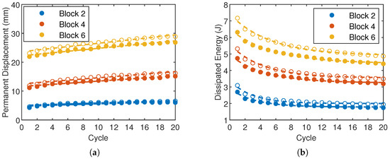 The comparison of accumulated permanent set and dissipated energy measured in the loading–unloading loop (force vs displacement) at different displacement levels is shown in Figure 9. Both materials exhibit comparable behaviors, yet filled TPU demonstrates a higher energy dissipation and permanent set upon unloading. Figure 9a illustrates the evolution of the permanent set as a function of repeated cycles for various displacement levels. For the lowest applied displacement (Block 2, 20 mm), there are no pronounced differences between the two materials, and neither material shows a significant increase in the accumulated permanent deformation for repeated loadings. In contrast, at higher applied deformation levels, the permanent set progressively increases with the number of cycles, following a trend that is well described by a linear relationship. For an applied displacement of 40 mm (Block 4), the slope of the fitted linear expression is mm/cycle for TPU and mm/cycle for CNT-TPU. These values increase to mm/cycle and mm/cycle, respectively, at an applied displacement of 60 mm (Block 6). The area enclosed by the loading–unloading curve (force vs displacement) is largest in the first cycle (Figure 9b) and then decreases gradually, following an exponential trend. No substantial changes are observed after the 10th cycle, as also shown in the stress-softening response, indicating a stabilized material behavior. At each deformation level, CNT-TPU exhibits higher dissipated energy compared to unfilled TPU, and the differences between the two materials are more pronounced as the deformation level increases. This confirms that inelastic phenomena are amplified by both increasing the applied deformation and filler content [45,51].