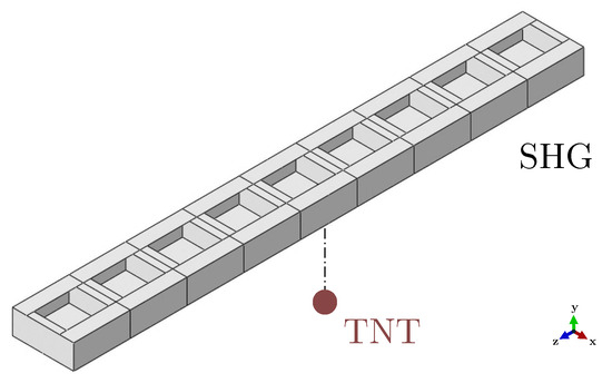 This section addresses the numerical modelling procedure for the SHG in Figure 2 and the associated small-scale models. The prototype and the scaled models were investigated numerically through coupled Eulerian–Lagrangian analyses. Hence, the fluid part, i.e., the dynamics of the underwater explosion, was analysed using the Eulerian solver, while the structural part, i.e., the SHG, was described using the Lagrangian solver. Fluid–structure interaction (FSI) was modelled through a coupling algorithm. This required the definition of a coupling surface that acts as a boundary to the flow of material in the Eulerian mesh, while the stresses in the Eulerian material exert forces on the surface, distorting the Lagrangian mesh. The Eulerian mesh was analysed through a multi-material solver, in which water was modelled according to a polynomial equation of state (Equation (1)), including only the bulk modulus MPa, kg/ and imposing a zero cut-off pressure. This latter condition handles cavitation, preventing regions of nonphysical negative pressure. The TNT explosive was described by the Jones–Wilkins–Lee (JWL) equation of state (Equation (2)) [16], with the parameters taken from Ref. [17] and listed in Table 1. The JWL equation of state (EOS) is the most commonly adopted model to describe the adiabatic expansion of detonation products. Its parameters are empirical and calibrated experimentally for different types of explosives. The last term in the equation corresponds to the EOS of ideal gases, while the two exponential terms are introduced to ensure its validity across a wider pressure range. A detailed explanation of how to determine the empirical parameters can be found in Ref. [16]. The detonation is initiated at the charge centre and proceeds at a constant velocity m/s). Finally, air was modelled as an ideal gas (Equation (3)) with constant . The subscripts w, TNT, and a were added in Equations (1)–(3) to explicitly refer to water, explosive, and air, respectively.