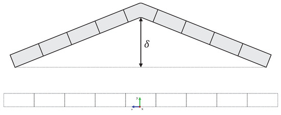 Figure 6 illustrates the hogging motion of the SHG caused by the primary shock for various Lagrangian element sizes. These curves were obtained using the auxiliary structural elements. The numerical results were compared to the raw experimental data and the corresponding quadratic fitting. The raw data were extracted from Ref. [14], while the quadratic fitting was slightly modified as the original work lacked specific details on how the first data point, corresponding to the beginning of the transient, was derived. Therefore, the first experimental point was excluded, and the fitting was performed on data expressed in (mm, ms) instead of (m, s), leading to Equation (16). This improved the quality of the approximation, increasing the coefficient of determination from 0.996 to 0.999, and provided a fairer comparison with the numerical results. As an example, Figure 7 shows the deformed configuration of the SHG discretised with 10 mm elements at maximum hogging. The plastic hinge at the midpoint and the rigid behaviour of the side surfaces were accurately captured. Figure 8 provides a zoom-in view of the central cabin of the SHG at the same time instant to show the local deformation of the lower plate. The global deformation of the structure aligned with the experiments, although the local behaviour of the two side plates was not perfectly replicated. A similar local deformed shape was obtained in the original work numerically; hence, the model is deemed accurate.