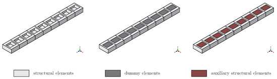 In this work, to overcome the limitation mentioned above, dummy elements were replaced with structural elements similar to those adopted for the entire SHG. This ensured a closed surface and solved the issues caused by the fast coupling algorithm. Additionally, to replicate the nature of the dummy elements, which lack mass and stiffness, the same material models used for the mild steel were employed by reducing thickness, stiffness, and/or density. The different coupling strategies are illustrated in Figure 4. Although the auxiliary structural elements are even less physically rigorous compared to dummy blocks, they proved effective and allowed for satisfactory results in the numerical simulations. Readers are referred to Section 3 to assess the influence of the auxiliary elements.