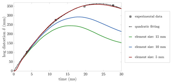 Comparison between numerically computed and experimental hog distortion with variable Lagrangian element size (both structural and auxiliary).