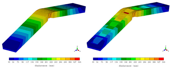 Displacement contour plot at maximum hogging ( = 17.5 ms) for the SHG prototype discretised with a 10 mm mesh: structural and auxiliary elements (left); only structural elements (right).