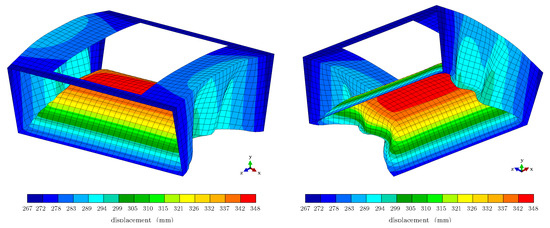 Displacement contour plot at maximum hogging ( = 17.5 ms) for the central cabin of the SHG prototype discretised with a 10 mm mesh: top view (left) and bottom view (right).