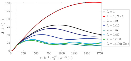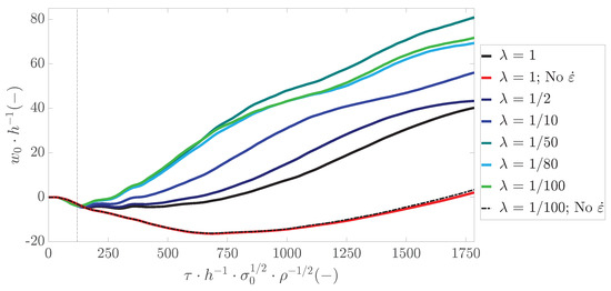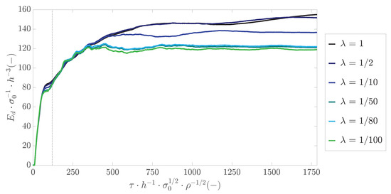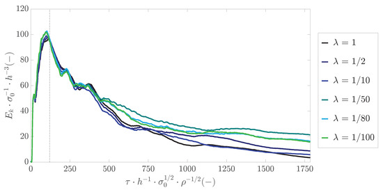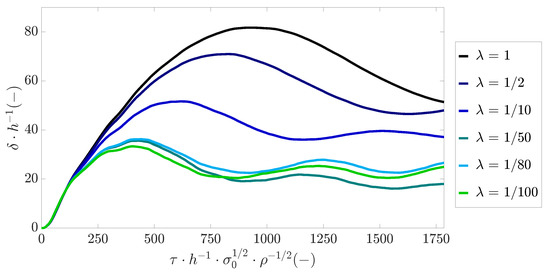 The scaled numerical models of the prototype were obtained using a Lagrangian mesh with a fixed element density, which was defined by the original mesh with 15 mm elements. This choice reduced the computational time by approximately one order of magnitude, and, despite the numerical results slightly differing from the experimental behaviour, it did not affect the scaling procedure. Figure 9 shows the results in dimensionless terms for six different values of the geometric scaling factor . defines the numerical prototype, and the hogging motion curve coincides, after non-dimensionalisation, with the one presented in Figure 6, considering 15 mm finite elements. The remaining curves were obtained from models scaled down relative to the prototype. The hogging motion of the scaled models significantly diverged from the prototype trend for non-dimensional times () greater than approximately 120. As the scaling factor increased, the hogging of the structure progressively decreased, showing similar behaviour for lower scaling factors.