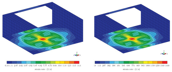 This expression shows that, with static yield strength and density kept constant, the strain rate is inversely proportional to the geometric scale factor. This is confirmed by the numerical results shown in Figure 10, which focus on the central cabin and two different scale factors and . As a result, the dynamic stress varies as predicted by Equation (4), leading to a stiffer response in the scaled models. Similar results have been reported in the literature concerning impact problems [23].