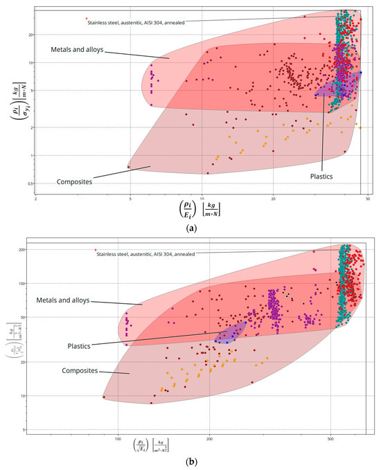 In this context, Multi-Criteria Decision Analysis (MCDA) methods are often applied to perform material selection based on individual properties such as failure load, tensile strength, and cost; in this regard, the literature provides a series of studies which are based on such multi-criteria approaches [9,10,11,12,13,14,15,16,17]. That said, while the use of MCDA methods strongly simplifies the selection process, it often fails to fully capture the specific physical phenomena relevant to the given case studies. This point certainly represents an advantage in favor of the Ashby method as it better reflects material specificities using performance indices derived from the combination of multiple physical and mechanical properties. That said, it has to be taken into account that cost considerations are often limited to raw material acquisition, thus neglecting manufacturing costs and the environmental impacts associated with the entire component life cycle, such as disposal and recycling at end of life.