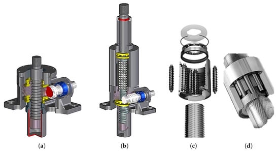The first type, the trapezoidal screw, is mainly used for cheaper applications (which generally require low axial velocity) but is characterized by high friction and high backlash, i.e., the axial distance between the two parallel faces of the threads of the nut and screw, which causes a discontinuity in the applied load during reversal. During load-sign inversion, the sample is not subjected to external load until the threads of the nut and screw come into contact again. The other three screw types were mainly developed to reduce friction between the nut and the screw by interposing an element such as a ball (ball screw) or roller (inverted or recirculating ball screw). Furthermore, in these types of screws, backlash can be reduced or eliminated by preloading the rolling elements within the system. The main differences between a ball screw and a roller screw are their maximum velocity and load capacity. The former is used in high-speed applications, while the latter is used in high-load applications. In addition, the roller screw generally has a smaller pitch than the ball screw, making it more suitable for applications requiring small axial displacements with high accuracy, and it meets the performance requirements for this application.