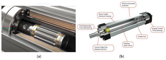 When performing fatigue tests, the load application system may experience a sign reversal depending on the selected load ratio parameter . During the reversal, the specimen shifts from a tensile to a compressive stress state, and if there is any backlash in the load application system, there will be a period of time when the specimen does not experience any loading. Traditional fatigue testing machines use hydraulic actuators, which have no backlash but are expensive to purchase, maintain, and operate. Additionally, they have a significant environmental impact due to the periodic disposal of spent hydraulic oil and high energy consumption, especially if they do not have an adjustable flow rate pump. To overcome these issues, jacks employing rolling elements provide a valid solution. Actuators with recirculating ball screws may not be suitable due to low wear resistance and high pressure in the ball–screw contact. Thorough market research indicates that inverted roller screw jacks are more suitable for specific purposes. These jacks have many advantages, such as reduced pitch, the ability to apply high loads (15× that of ball screws), reduced clearance between the screw and nut, and long component lifetimes (2× that of ball screws). However, these technological advantages come at a higher cost, approximately 10× that of a ball screw jack with the same load capacity. Figure 2a shows a planetary inverted rolled screw system as an example. Many companies manufacture this type of linear actuator but it is not yet common, which makes procurement difficult, especially when buying small quantities. The FTX 125 linear actuator, made by EXLAR and illustrated in Figure 2b, was selected for this specific application, and its main operating parameters are listed in Table 1.
